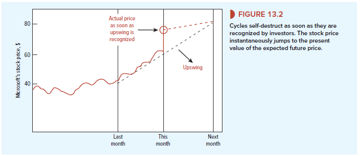 Figure 13.1 suggests that successive price changes of all four stocks were effectively uncorrelated. Today’s price change gave investors almost no clue as to the likely change tomorrow. Does that surprise you? If so, imagine that it were not the case and that changes in Microsoft’s stock price were expected to persist for several months. Figure 13.2 provides an example of such a predictable cycle. You can see that an upswing in Microsoft’s stock price started last month, when the price was $40, and it is expected to carry the price to $80 next month. What will happen when investors perceive this bonanza? It will self-destruct. Since Microsoft stock is a bargain at $60, investors will rush to buy. They will stop buying only when the stock offers a normal risk-adjusted rate of return. Therefore, as soon as a cycle becomes apparent to investors, they immediately eliminate it by their trading.