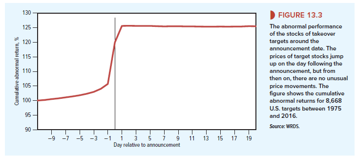Figure 13.3 illustrates how the release of news affects abnormal returns. It shows the cumulative abnormal return on a sample of U.S. firms that were targets of takeover attempts. Acquiring firms usually have to pay a substantial takeover premium to get the deal done, so the target firm’s stock price increases as soon as the takeover bid is announced. Figure 13.3 shows the average pattern of the target’s stock returns before and after the announcement of a takeover (day 0 in the figure). Stock prices drift up before date zero, as investors gradually realize that a takeover may be coming. On the day of the announcement and the following day, prices jump up by 17.3%.[10] The adjustment to the stock price is immediate and complete. There is no significant further drift in the price, either upward or downward. Thus, within the day, the new stock prices reflect (at least on average) the magnitude of the takeover premium.