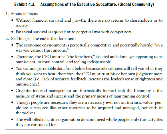 A third generic subculture that exists in all organizations is the executive subculture based on the fact that top managers in all organizations share a similar environment and similar concerns. Sometimes, this subculture is represented by just the CEO and his or her executive team. The executive worldview is built around the necessity to maintain the financial health of the organization and is fed by the preoccupations of boards, of investors, and of the capital markets. Whatever other preoccupations executives may have, they cannot get away from having to worry about and manage the financial issues of the survival and growth of their organization. In private enterprise, the executives have to worry specifically about profits and return on investments, but financial issues around survival and growth are just as salient in the public and nonprofit enterprise. The essence of this executive subculture is described in Exhibit 4.3.