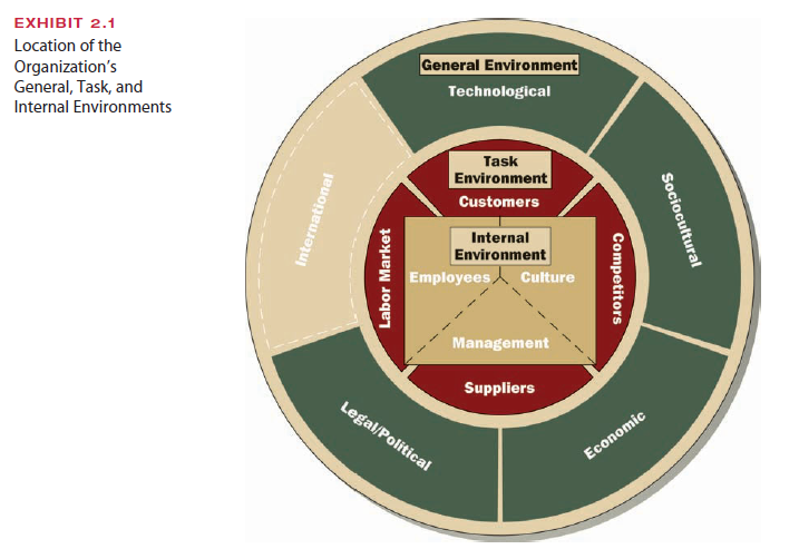 Exhibit 2.1 illustrates the relationship among the general, task, and internal environ- ments. As an open system, the organization draws resources from the external environment and releases goods and services back to it. We now will discuss the two layers of the exter- nal environment in more detail. Then we will discuss corporate culture, the key element in the internal environment. Other aspects of the internal environment, such as structure and technology, will be covered in Parts Three and Four of this book.