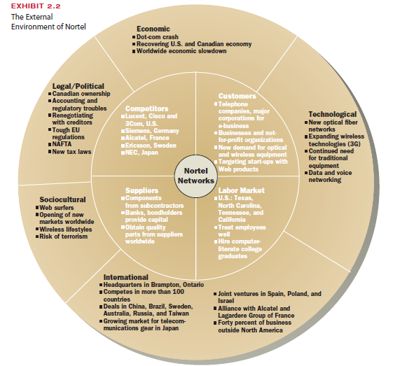 Nortel Networks. The external environment for Nortel Networks is illustrated in Exhibit 2.2. The Canadian-based company began in 1895 as a manufacturer of telephones and has reinvented itself many times to keep up with changes in the environment. In the late 1990s, the company transformed itself into a major player in wireless technology and equipment for connecting businesses and individuals to the Internet. In 1997, the com- pany was about to be run over by rivals, such as Cisco Systems, who were focused on Internet gear. Then-CEO John Roth knew he had to do something bold to respond to changes in the technological environment. A name change to Nortel Networks symbol- ized and reinforced the company’s new goal of providing unified network solutions to customers worldwide.