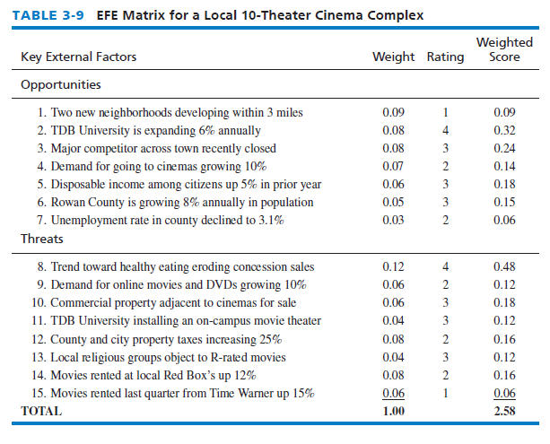 An example of an EFE Matrix is provided in Table 3-9 for a local 10-theater cinema complex. Observe in the table that the most important factor to being successful in this business is “Trend toward healthy eating eroding concession sales,” as indicated by the 0.12 weight. Also note that the local cinema is doing excellent in regard to handling two factors, “TDB University is expanding 6 percent annually” and “Trend toward healthy eating eroding concession sales.” Perhaps the cinema is placing flyers on campus and also adding yogurt and healthy drinks to its concession menu. Note that you may have a 1, 2, 3, or 4 anywhere down the Rating column. Observe also that the factors are stated in quantitative terms to the extent possible, rather than being stated in vague terms. Quantify the factors as much as possible in constructing an EFE Matrix. Note also that all the factors are “actionable” instead of being something like “The economy is bad.” Finally, note that the total weighted score of 2.58 is above the average (midpoint) of 2.5, so this cinema business is doing pretty well, taking advantage of the external opportunities and avoiding the threats facing the firm. There is definitely room for improvement, though, because the highest total weighted score would be 4.0. As indicated by ratings of 1, this business needs to capitalize more on the “Two new neighborhoods developing [nearby]” opportunity and the “movies rented from … Time Warner” threat. Notice also that there are many percentage- based factors among the group. Be quantitative to the extent possible! Note, too, that the ratings range from 1 to 4 on both the opportunities and threats.