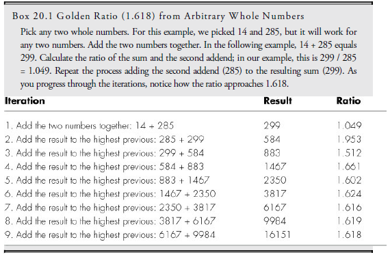 There are a number of reasons why this sequence is of interest to mathematicians and scientists. One reason is the relationship that the sequence has to the “golden ratio.” Except in the very low numbers, the ratio of any number in the sequence to the next lower number is 1.618 (for example, 144/89 = 1.61798); the ratio of any number in the sequence to the next highest number approaches 0.618 (for example, 55/89 = 0.61798). The number 1.618, known as the golden ratio, and its reciprocal of 0.618, possess many interesting properties. For example, it is the only number that when added to 1 is the same as 1 divided by itself. Another fascinating fact is that 1.618 multiplied times 0.618 = 1. There are many more strange relationships between .618 and whole numbers; see Box 20.1 for a demonstration of the “mystery” of this number. Mathematicians use the Greek letter phi to refer to this ratio.