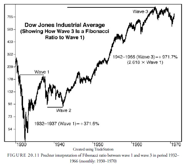 Elliott wave enthusiasts, to predict retracements and price targets, as we have already seen, and to project the timing of the next series of waves, use Fibonacci ratios. For example, Prechter notes that corrective waves tend to correct approximately 61.8%, or its complement 38.2% (100% – 61.8%), of their corresponding impulse waves. Prechter is quick to point out, however, that this is a tendency, not even a guideline, and is not dependable. He found that more reliable relations exist in projecting target prices for alternating waves. For example, in percentage terms, impulse waves tend to be related in some manner by 2.618, 1.618, 0.618, or 0.382 As an example, he noted that the rise in the Dow Jones Industrial from the low in 1932 to 1937, wave 1 gained 371.6%, whereas wave 3 from 1942-1966 gained 971.7%, 2.618 times as much. This relationship is pictured in Figure 20.11.