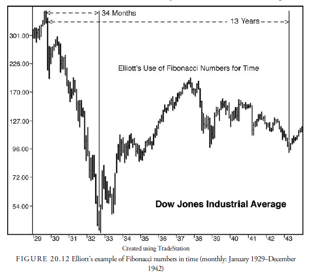 In addition to the extent of price movements in waves being related by Fibonacci numbers, times in stock market data have been related to the Fibonacci ratio. However, this exercise is spurious at best. Tables are often used to show the time differences between important peaks and valleys in market prices that occurred in a Fibonacci number of years, months, or days. Elliott himself used the example of the 34 months between the peak in September 1929 and the bottom in July 1932 and the 13 years between the peak in 1929 and the low in 1942 (see Figure 20.12). Although others also have seen a relation between Fibonacci time counts and important events, Hamilton Bolton, a contemporary of and correspondent with Elliott, and publisher of the Bank Credit Analyst, stated, “Permutations tend to become infinite” (Frost and Prechter, 2000, p. 141). One of the tenets of any technical theory is that the principles must make sense. In the case of time, which is determined somewhat arbitrarily by humans and differently over the ages, the likelihood of there being a consistent series of time intervals that follow Fibonacci sequence numbers is a little far-fetched. Indeed, a comprehensive study by Herbert Riedel, PhD (1989) on 182 days of the Dow Jones Industrial Average in 1985 demonstrated that no evidence of Fibonacci ratios was present either in retracements or in timing.
