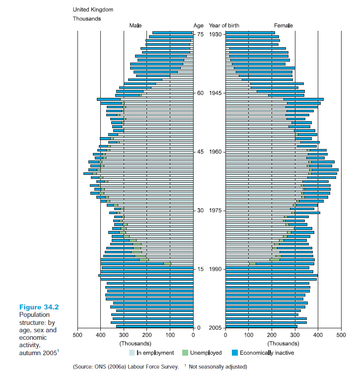 The birth rate increased substantially after the Second World War and continued at relatively high levels until the late 1960s. Over a million babies were born at the peak in 1964. This created the large ‘baby boom’ generation who are now in their forties and fifties. From 1964 onwards the UK saw a sharp decline in its birth rate, which reached a low point in 1977 when only 657,000 babies were born (i.e. fewer than the number of deaths). This was due in part to the relatively low number of births in the country in the war years (1939-45), in part to the wide availability of the contraceptive pill and abortion, and partly to changes in social attitudes leading to later marriages. The downward trend was reversed somewhat in the 1980s as the baby boomers had children, but fertility rates remain at relatively low levels historically. As a result of these patterns, we have an ageing population. There are many more people in the UK in their forties and fifties than there are in their twenties and thirties (see Figure 34.2).