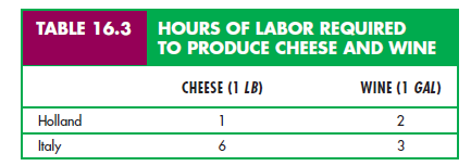 When each of two countries has a comparative advantage, they are better off producing what they are best at and purchasing the rest. To see this, suppose that the first country, Holland, has an absolute advantage in producing both cheese and wine. A worker there can produce a pound of cheese in 1 hour and a gallon of wine in 2 hours. In Italy, on the other hand, it takes a worker 6 hours to produce a pound of cheese and 3 hours to produce a gallon of wine. The production relationships are summarized in Table 16.3.