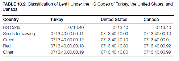 In the example in Table 18.2, lentil is coded as 071340 in Turkey, the United States, and Canada. However, some countries add more digits (the United States, South Korea, the European Union, and Canada add four additional digits (total of ten digits); Turkey adds six more digits; India adds two more digits; and Japan adds three more digits) to suit their national statistical and trading needs.