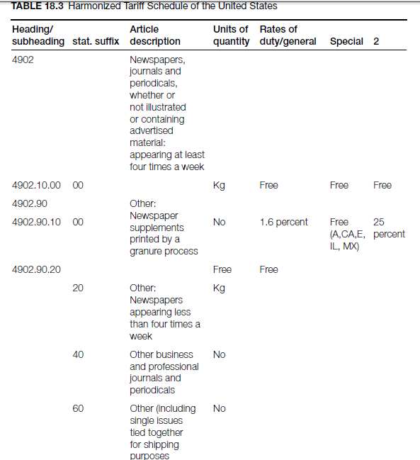 Goods imported are subject to duty or duty-free status in accordance with their classification under the U.S. code (HTSUS). Duty-free status, for example, is available under certain conditional exemptions provided in column 1 of the tariff schedule. Column 2 is intended for countries that do not qualify for the most-favored-nation (MFN) duty rate, and imports under this category are subject to the highest rate (Table 18.3). In cases in which the correct classification is not certain or the product falls under more than one classification, it is important to resort to the body of interpretative rules provided under the HTSUS or to seek a binding tariff classification ruling from customs, which can be relied on before placing or accepting orders. Although the average tariff rate in the United States is now around 5 percent, some imports are subject to high tariffs: watch parts (151.2 percent), some shoe imports (67 percent). In certain cases, it is also possible for customs to reverse its classification even after the product has been imported and used. The U.S. Customs Service reversed its decision on imports of muffin mix toppings in 1996 and required the importer to pay a $750,000 penalty for violating the U.S. sugar quota (the decision was, however, reversed for the second time). In another case, imports of large antique red telephone booths were blocked on the grounds that the product was actually a steel product restricted by import quotas (Bovard, 1998). Thus, one cannot overemphasize the importance of obtaining expert opinion, seeking an advance ruling by customs, or establishing reliable procedures on the correct description and classification of a given product before importation.