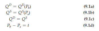 If we know the demand curve QD(Pb), the supply curve QS(Ps), and the size of the tax t, we can solve these equations for the buyers’ price Pb, the sellers’ price Ps, and the total quantity demanded and supplied. This task is not as difficult as it may seem, as we will demonstrate in Example 9.7.