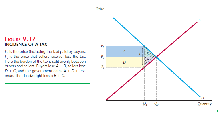 Who bears the burden of the tax? In Figure 9.17, this burden is shared roughly equally by buyers and sellers. The market price (the price buyers pay) rises by half of the tax, and the price that sellers receive falls by roughly half of the tax.
