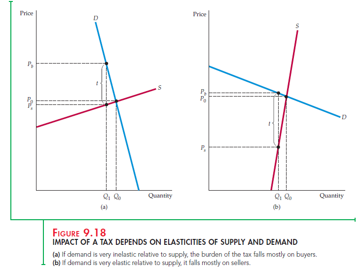 Figure 9.18(b) shows the opposite case: If demand is relatively elastic and supply is relatively inelastic, the burden of the tax will fall mostly on sellers.