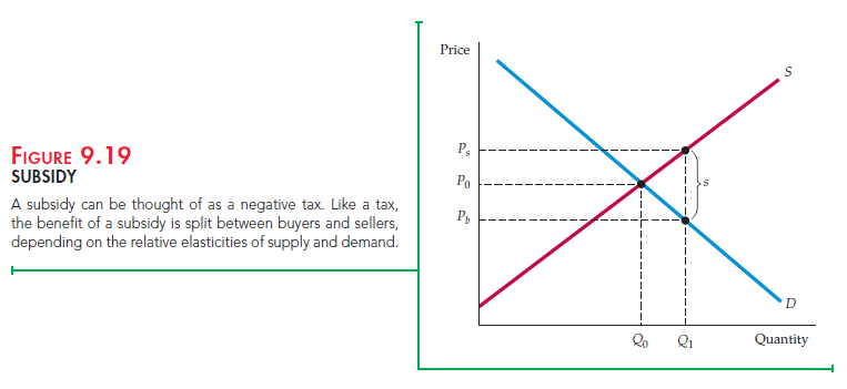 Figure 9.19 illustrates this. At the presubsidy market price P0, the elasticities of supply and demand are roughly equal. As a result, the benefit of the subsidy is shared roughly equally between buyers and sellers. As with a tax, this is not always the case. In general, the benefit of a subsidy accrues mostly to buyers if Ed/Es is small and mostly to sellers if Ed/Es is large.