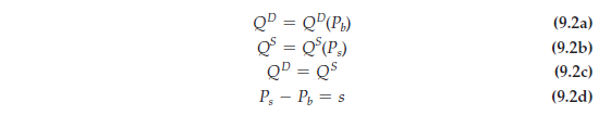 As with a tax, given the supply curve, the demand curve, and the size of the subsidy s, we can solve for the resulting prices and quantity. The same four conditions needed for the market to clear apply for a subsidy as for a tax, but now the difference between the sellers’ price and the buyers’ price is equal to the subsidy. Again, we can write these conditions algebraically:
