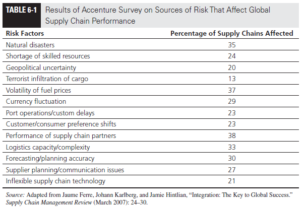 The Accenture survey categorized risk in global supply chains, as shown in Table 6-1, and asked respondents to indicate the factors that affected them. More than a third of the respondents were affected by natural disasters, volatility of fuel prices, and the performance of supply chain partners.