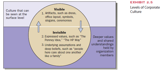Culture can be analyzed at three levels, as illustrated in Exhibit 2.5, with each level be- coming less obvious.38 At the surface level are visible artifacts, which include things such as manner of dress, patterns of behavior, physical symbols, organizational ceremonies, and office layout. Visible artifacts are all the things one can see, hear, and observe by watching members of the organization. At a deeper level are the expressed values and beliefs, which are not observable but can be discerned from how people explain and justify what they do.