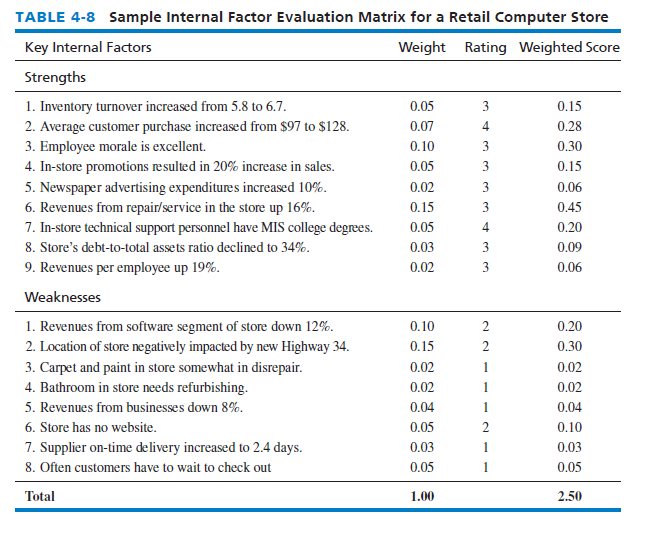 An example IFE Matrix is provided in table 4-8 for a retail computer store. the table reveals that the two most important factors to be successful in the retail computer store business are “Revenues from repair/service in the store” and “Employee morale.” Note that the store is doing best on “Average customer purchase” amount and “In-store technical support.” the store is having major problems with its carpet, bathroom, paint, and checkout procedures. Note also that the matrix contains substantial quantitative data rather than vague statements; this is excellent. Overall, this store receives a 2.5 total weighted score, which on a 1 to 4 scale is exactly average/ halfway, indicating there is definitely room for improvement in store operations, strategies, policies, and procedures.
