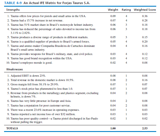 An actual IFE Matrix for Forjas taurus S.A. is provided in table 4-9. Headquartered in Porto Alegre, Brazil, taurus manufactures and sells military and civilian pistols, submachine guns, rifles, ammunition, bulletproof vests, motorbike helmets, and more. Note that the total weighted score of 2.53 is barely above the average of 2.50. Note, too, that the most important factor in the industry (Weight = 0.09) is price, and Taurus does excellent (Rating = 4) in selling low-priced firearms.
