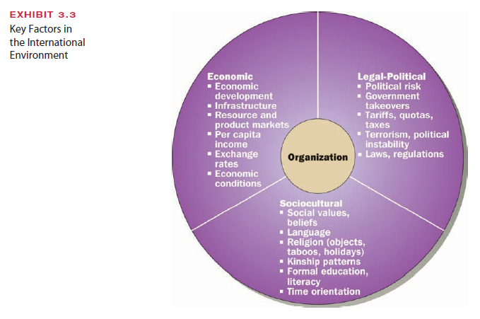 Some of these examples seem humorous, but there’s nothing funny about them to man- agers trying to operate in a highly competitive global environment. What should managers of emerging global companies look for to avoid obvious international mistakes? When they are comparing one country with another, the economic, legal-political, and sociocultural sectors present the greatest difficulties. Key factors to understand in the international envi- ronment are summarized in Exhibit 3.3.