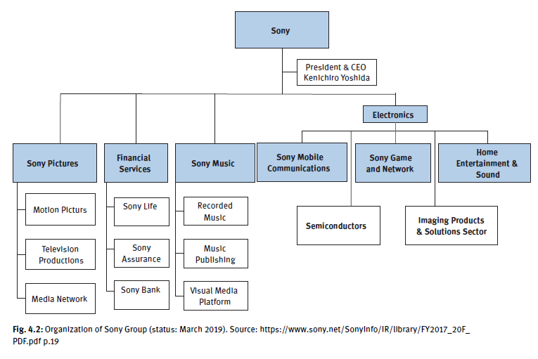 Over the years, Sony became involved in diversified business fields away from consumer electronics to gaming pictures; financial services; music; movies; banking; life insurance; cameras, semiconductors and others. The current organizational structure reflecting the diversified business of Sony (status: 2019) is illustrated in Figure 4.2.
