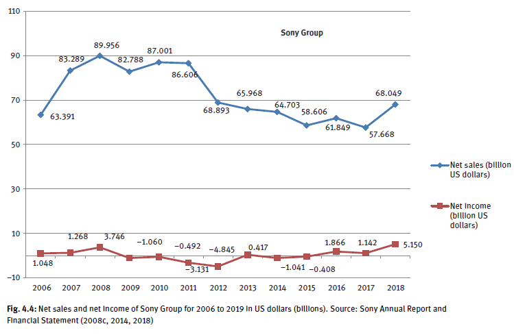 The LCD market in Europe became saturated in 2008; and, within a very short time, Sony’s management realized that its LCD television set business performed far less well than expected (Sony 2008e). In parallel, the entertainment business (movies and music) did not develop as successfully as planned, which further weakened the firm’s overall business performance. Net sales stagnated and went down. The analysis of net income (loss) presented in Figure 4.4 underlines Sony’s worsening situation. The data indicate, for example, for 2009 (loss of USD 1.1 billion), 2010 (loss of USD 0.492), 2011 (loss of USD 3.13 billion), and 2012 (loss of USD 4.85 billion) (Sony 2014; Sony_Financial_Holdings 2014).