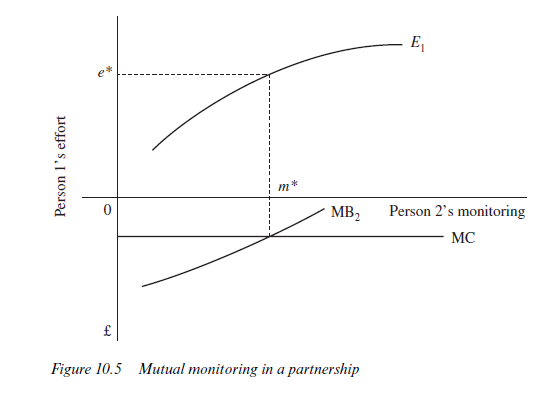 The effort of Person 1 increases with the monitoring of person 2 (curve Ej). We assume that extra monitoring increases the accuracy of observation. Greater work effort will be more effective at reducing peer pressure when observation is accurate than when it is inaccurate. Thus, person 1 will find it worthwhile to increase his or her effort in response to greater monitoring by person 2. Assuming that monitoring is not entirely costless, person 2 will monitor only to the point at which his or her private gains from person l’s extra effort (in this case one half of the additional output) equal the extra monitoring costs incurred (MC). With diminishing returns to effort, person 2’s marginal benefit from person l’s extra effort is given by curve MB2. In the context of identical individuals, both will monitor with intensity m* and work with intensity e*.