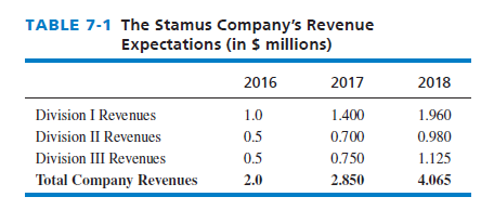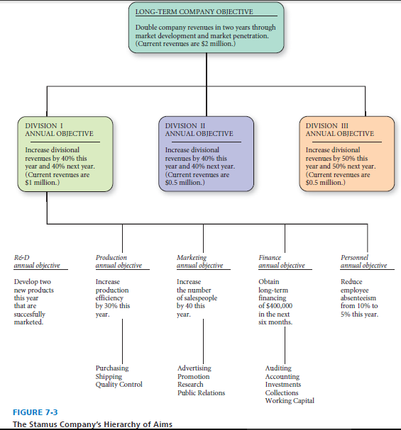 Clearly stated and communicated objectives are critical to success in all types and sizes of firms. annual objectives are often stated in terms of profitability, growth, and market share by business segment, geographic area, customer groups, and product. Figure 7-3 illustrates how the Stamus Company could establish annual objectives based on long-term objectives. Table 7-1 reveals associated revenue figures that correspond to the objectives outlined in Figure 7-3. Note that, according to plan, the Stamus Company will slightly exceed its long-term objective of doubling company revenues between 2016 and 2018. Figure 7-3 also reflects how a hierarchy of annual objectives can be established based on an organization’s structure. objectives should be consistent across hierarchical levels and form a network of supportive aims. Horizontal consistency of objectives is as important as vertical consistency of objectives. For instance, it would be ineffective for manufacturing to achieve more than its annual objective of units produced, if marketing could not sell the additional units.