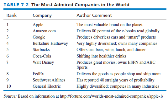 Based on management activities such as establishing clear annual objectives, Fortune annually ranks companies as the most admired in the world; its recent ranking is revealed in Table 7-2. Note that the top 10 firms are U.S. companies, but two outside-U.S.-headquartered companies made the top 20: BMW (#14) and Singapore Airlines (#18).