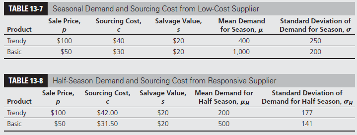 A local supplier had heard that Tiffany was reconsidering product sourcing. It proposed filling Winner’s needs in two deliveries. The first delivery would arrive before the start of the season and be designed to cover about a half-season of sales. The second delivery would arrive around the middle of the season, but the timing and quantity could be adjusted to account for sales in the first half. The supplier promised delivery to ensure no stockouts during the first half. In other words, the supplier would bring in the second delivery early (and a larger quantity) if sales in the first half seemed to be higher than predicted. If sales in the first half were slower than anticipated, Winner could reduce the amount ordered for the second delivery. For this flexibility, the local supplier wanted a premium of 5 percent compared to the low-cost supplier. If purchased from the local supplier, the Trendy line would thus cost $42 (instead of $40) per unit and the Basic line would cost $31.50 (instead of $30). Tiffany felt that with a midseason delivery, any customers who could not find product during the first half of the season would return for the second half and purchase the item. Thus, there would be no lost sales during the first half of the season. Her team prepared the demand and cost data shown in Tables 13-7 and 13-8. Tiffany had to decide whether the responsiveness of the local supplier was worth the additional 5 percent in unit cost.