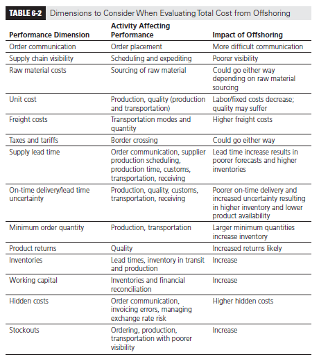 The significant dimensions of total cost can be identified by focusing on the complete sourcing process when offshoring. It is important to keep in mind that a global supply chain with offshoring increases the length and duration of information, product, and cash flows. As a result, the complexity and cost of managing the supply chain can be significantly higher than anticipated. Table 6-2 identifies dimensions along which each of the three flows should be analyzed for the impact on cost and product availability.