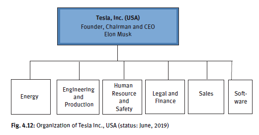 According to Tesla’s business mission, the firm designs, develops, manufactures and sells high-performance fully electric vehicles, as well as energy generation and storage systems, including installing and maintaining such systems. In addition, Tesla designs and sells solar electricity modules, which are installed on buildings. Tesla makes use of vertically integrated value-adding activities, ranging from research and development, solar electricity generation, electricity storage and electricity consumption through its Tesla cars (Tesla 2017). The core of an electric car is the battery, which Tesla is involved in manufacturing. The depth of the vertical integration makes Tesla very different from conventional car-makers. The organizational structure of Tesla, combining major business divisions with administrative functions, only partially illustrates the firm’s profound vertical integration. Tesla’s firm structure as of mid-2019 rather resembles a start-up than a multibillion dollar company (compare Figure 4.12).