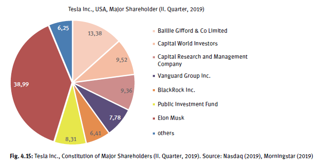 Elon Musk holds the majority of the Tesla’s company shares (around 40 percent), followed by large institutional investors such as Baillie Gifford & Co. Limited (13 percent), Capital World Investors (10 percent), Capital Research and Management Company (9 percent) and Vanguard Group Inc. (8 percent), BlackRock Inc. (6 percent), Public Investment Fund (8 percent) and others (6 percent) (Morningstar 2019; Nasdaq 2019) (compare Figure 4.15).