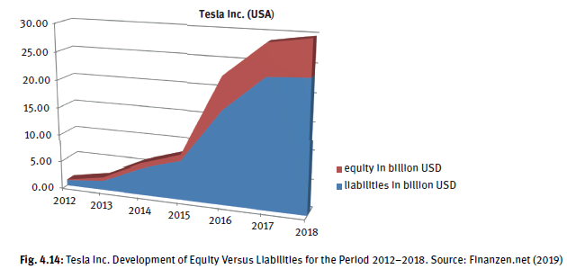 There is no question that Tesla’s entering the automotive market as a newcomer introducing electric cars has caused substantial financial investments. The turnaround from current losses towards annual profits requires a long breath. Consequently, the growth during recent years comes along with a sharp rise in liabilities. Tesla’s liabilities increased from around USD one billion in 2012 to USD 23 billion by the end of 2018. Nevertheless, Tesla’s firm equity during that period increased from USD 125 million (2012) to USD six billion (2018) (compare Figure 4.14). Even as liabilities sharply increased, the debt-to-equity ratio decreased from 7.9 in 2012 to 3.7 in 2018.