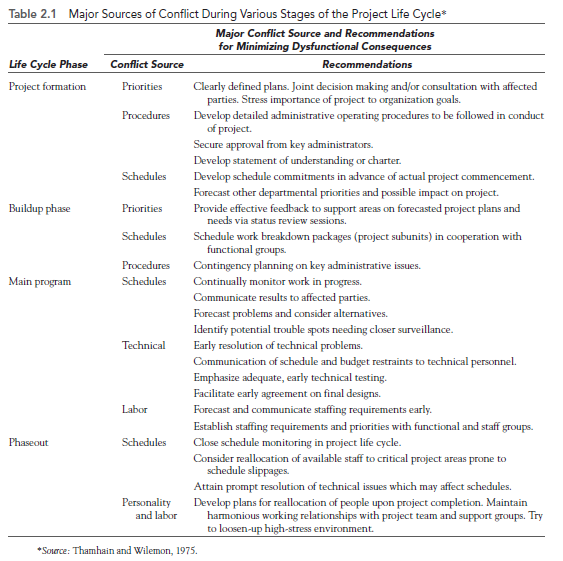Certain aspects of the data in Table 2-2 seem significant. Schedules are a major source of conflict throughout the project’s life. Priorities are a close second, particularly in the first two stages of the project’s life. Because the distinction between the project’s