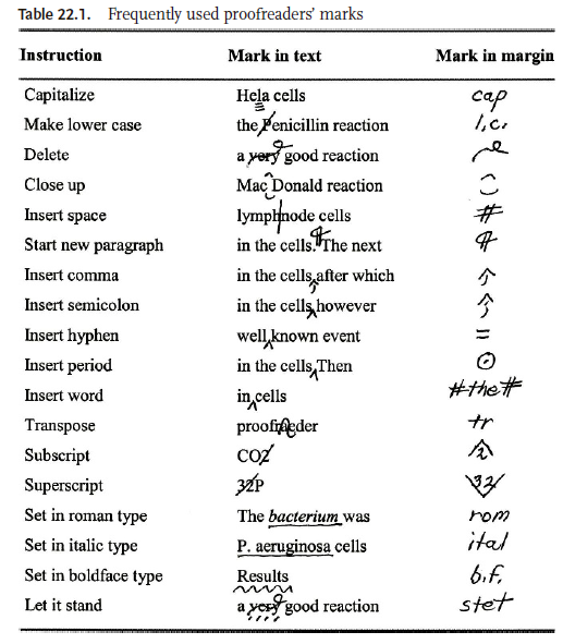 The long-established procedure is to mark each error twice on a hard copy of a proof, once at the point where it occurs and once in the margin opposite where it occurs. The compositor uses the margin marks to find the errors, as a correction indicated only in the body of the text can easily go unnoticed. Standard proofreading marks, the most common of which are listed in Table 22.1, should be used to indicate corrections. Normally, if you are to print out a hard copy and indicate corrections on it, the publisher provides a list of such marks along with the proof. Learning the main such marks can facilitate reviewing the proofs of your papers and aids in proofing typeset versions of other items you write.
