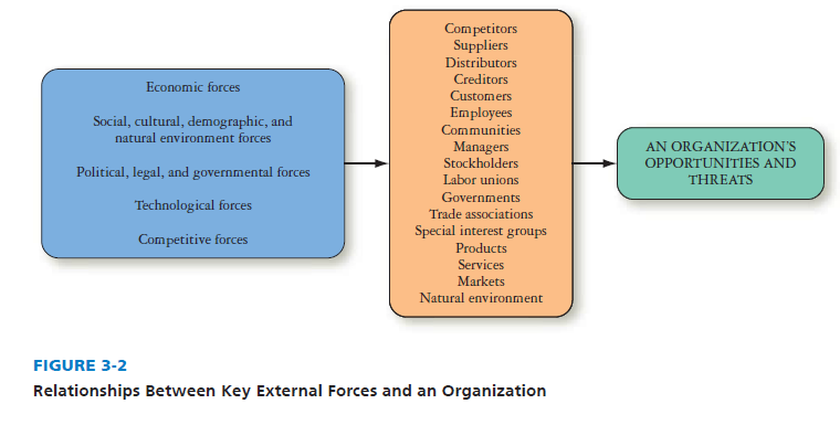 External forces can be divided into five broad categories: (1) economic forces; (2) social, cultural, demographic, and natural environment forces; (3) political, governmental, and legal forces; (4) technological forces; and (5) competitive forces. Relationships among these forces and an organization are depicted in Figure 3-2. External trends and events, such as rising food prices and people in African countries learning about online services, significantly affect products, services, markets, and organizations worldwide.