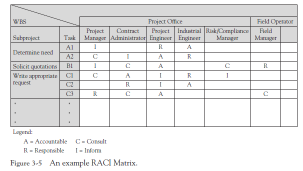 Like the WBS, the RACI Matrix comes in a variety of sizes and shapes. Typically, the RACI matrix is in the form of a table with the project tasks derived from the WBS listed in the rows and departments or individuals in the columns. PMBOK describes the RACI matrix in Chapter 9 on Human Resources. The value of the RACI Matrix is that it helps organize the project team by clarifying the responsibilities of the project team members. For an example of a simple RACI Matrix, see Figure 3-5.