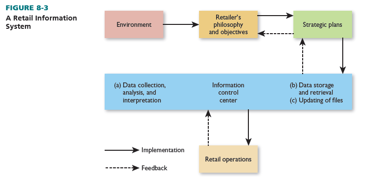 Figure 8-3 presents a general RIS. A retailer begins with its business philosophy and goals, which are affected by environmental factors (such as competitors and the economy). The philosophy and goals provide guidelines that direct strategic planning. Some aspects of plans are routine and need little re-evaluation. Others are nonroutine and need evaluation each time they arise.