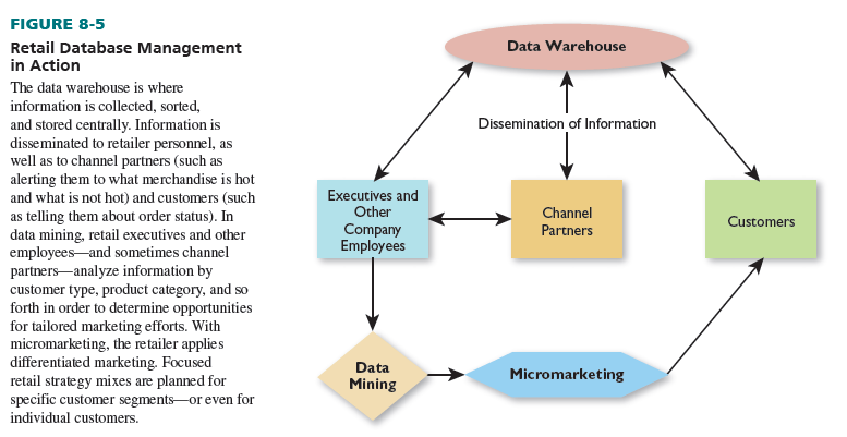 Let’s now discuss two aspects of database management: Data warehousing is a mechanism for storing and distributing information. Data mining and micromarketing are ways in which information can be utilized. Figure 8-5 shows the interplay of data warehousing with data mining and micromarketing.