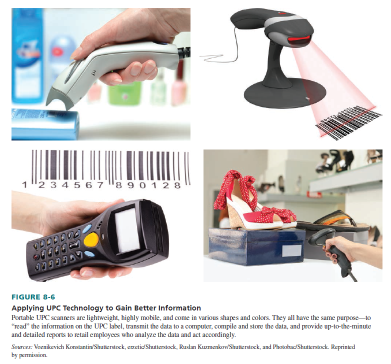 Since its inception more than 40 years ago, UPC technology has improved substantially. It is now the accepted retailing standard. Several billion scans occur every day. The UPC allows all stores in the retail sector to identify products and capture information about them. Stores can control inventory more efficiently, provide a faster and more accurate checkout for customers, and easily gather inventory data for accurate and immediate marketing reports. Virtually every time sales or inventory data are scanned by a computer, UPC technology is involved. More than 200,000 U.S. manufacturers and retailers belong to GS1 US (formerly known as the Uniform Code Council), a group that has taken the lead in setting and promoting inter-industry product identification and communication standards.15 Figure 8-6 shows how far UPC technology has come.