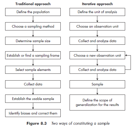 The traditional approach (see Figure 8.3) is typical of probability sampling, but it is also frequently encountered in the quota method. It starts by defining the target population, for which the results will be generalized through statistical inference. The population is operationalized in order to have clear criteria to determine the elements included in or excluded from the study population. The next step is to select a sampling method. It then becomes possible to determine the sample size. If a random sampling method is used, it will be necessary to choose or create a sampling frame in order to carry out random selection. The researcher then selects the sample elements and collects the required data. The elements for which all of the required data could in fact be collected constitute the study’s ‘usable’ sample. The last stage of this procedure is a study of potential biases and, if necessary, adjustment to the sample.