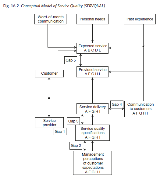 The concept of service quality gaps and SERVQUAL is an effective approach to study and analyse the differences between customer expectations and perceptions. Service specification form an integral part of the Service Quality (SERVQUAL) conceptual model shown in Figure 16.2. This model measures tangible and intangible service elements. It investigates discrepancies or gaps in the customer-supplier chain to highlight target areas where quality may be improved. The model shows that the customer expected service A-B-C-D-E, but at the end, as a result of the five gaps in the operations received A-F-G-H-I instead.