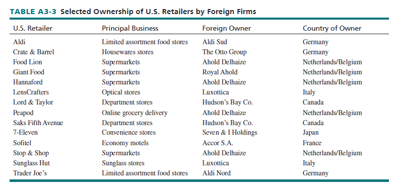 Although the revenues of U.S.-based retailers owned by foreign firms are hard to measure, they reach several hundred billion dollars annually. Foreign ownership in U.S. retailers is highest for general merchandise stores, food stores, and apparel and accessory stores. Examples of U.S.- based retailers owned by foreign firms are shown in Table A3-3.
