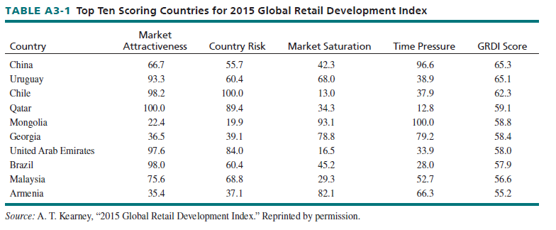 Yearly, A. T. Kearney ranks 30 developing nations on a 0- to 100-point Global Retail Development Index (GRDI) scale. Higher-ranked countries represent better opportunities to enter or expand in that market. The GRDI scores are based on four attributes: market attractiveness (25 percent), country and business risk (25 percent), market saturation (25 percent), and time pressure (25 percent).2 Table A3-1 shows the GRDI scores for the top 10 performing foreign countries.