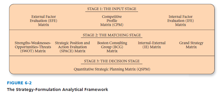 Stage 1 of the strategy-formulation analytical framework consists of the External Factor Evaluation (EFE) Matrix, the Internal Factor Evaluation (IFE) Matrix, and the Competitive Profile Matrix (CPM). Called the input stage, Stage 1 summarizes the basic input information needed to formulate strategies. Stage 2, called the matching stage, focuses on generating feasible alternative strategies by aligning key external and internal factors. Stage 2 techniques include the Strengths-Weaknesses-Opportunities-Threats (SWOT) Matrix, the Strategic Position and Action Evaluation (SPACE) Matrix, the Boston Consulting Group (BCG) Matrix, the Internal-External (IE) Matrix, and the Grand Strategy Matrix. Stage 3, called the decision stage, involves a single technique, the Quantitative Strategic Planning Matrix (QSPM). A QSPM uses input information from Stage 1 to objectively evaluate feasible alternative strategies identified in Stage 2. It reveals the relative attractiveness of alternative strategies and thus provides an objective basis for selecting specific strategies. The QSPM is a more robust way to determine the relative attractiveness of strategies than the 1) summed ranking method described above, or the 2) individual vs group ranking method described on pages 366-367 in Part 6).