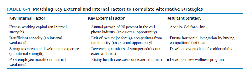 The strategy-formulation guidelines provided in Chapter 5 can enhance the process of matching key external and internal factors. For example, when an organization has both the capital and human resources needed to distribute its own products (internal strength) and distributors are unreliable, costly, or incapable of meeting the firm’s needs (external threat), forward integration can be an attractive ST strategy. When a firm has excess production capacity (internal weakness) and its basic industry is experiencing declining annual sales and profits (external threat), related diversification can be an effective WT strategy.