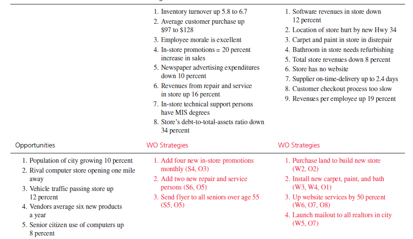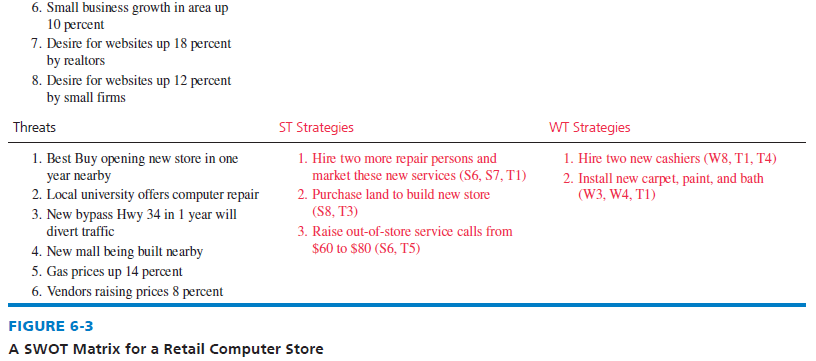 It is also important to include the “S1, O2” type notation after each strategy in a SWOT Matrix. This notation reveals the rationale for each alternative strategy. Strategies do not appear out of the blue. Note in Figure 6-3 how this notation reveals the internal and external factors that were matched to formulate desirable strategies. For example, note that this retail computer store business may need to “purchase land to build new store” because a new Highway 34 will make its location less desirable. The notation (W2, O2) and (S8, T3) in Figure 6-3 exemplifies this matching process.