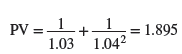 Now suppose you have to value $1 paid at the end of years 1 and 2. If the spot rates are different—say, r1 = 3% and r2 = 4%—then we need two discount rates to calculate present value: