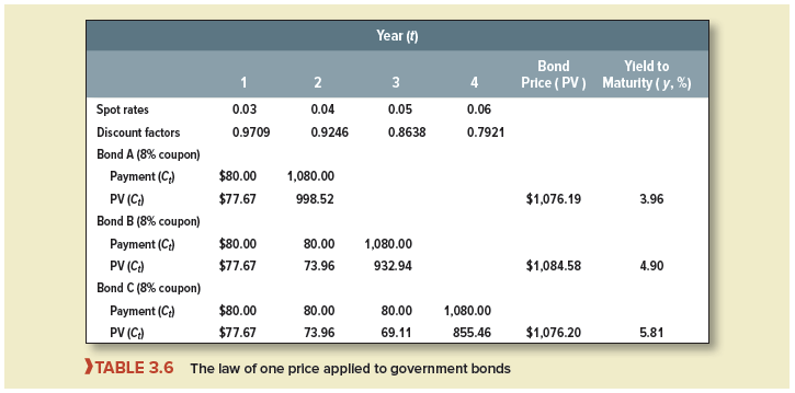 Table 3.6 illustrates how the law of one price applies to government bonds. It lists three government bonds, which we assume make annual coupon payments. All the bonds have the same coupon but they have different maturities. The shortest (bond A) matures in two years and the longest (bond C) in four.