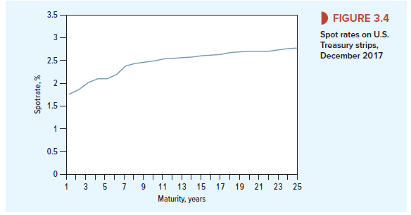 We can use the prices of strips to measure the term structure of interest rates. For example, in November 2017, a 10-year strip cost $793.37. In return, investors could look forward to a single payment of $1,000 in November 2027. Thus, investors were prepared to pay $.79337 for the promise of $1 at the end of 10 years. The 10-year discount factor was DF10 = 1/(1 + r10)10 = .79337, and the 10-year spot rate was r10 = (1/.79337)10 – 1 = .0234, or 2.34%. In Figure 3.4, we use the prices of strips with different maturities to plot the term structure of spot rates from 1 to 25 years. You can see that in 2017 investors required a higher interest rate for lending for 25 years rather than for 1.